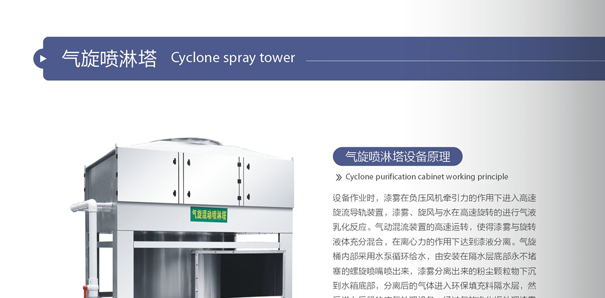 簡介:備作業時,漆霧在負壓風機牽引力的作用下進入高速旋流導軌裝置,漆霧、旋風與水在高速旋轉的進行氣液乳化反應。氣動混流裝置的高速運轉,使得漆霧與旋轉液體充分混合,在離心力的作用下達到漆液分離。氣旋桶內部采用水泵循環給水,由安裝在隔水層底部永不堵塞的螺旋噴嘴噴出來,漆霧分離出來的粉塵顆粒物下沉到水箱底部,分離后的氣體進入環保填充料隔水層,然后進入后段的廢氣處理設備。經過氣旋凈化柜處理漆霧凈化率可達95%以上。